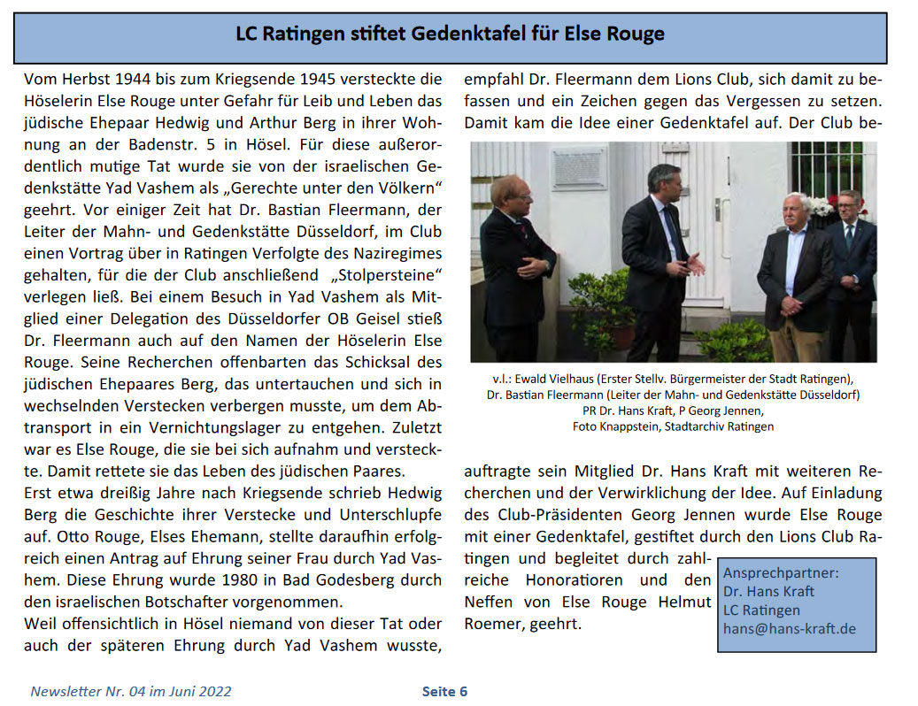 Der Ratinger Lions-Club stiftet eine Gedenktafel zu Ehren von Else Rouge.