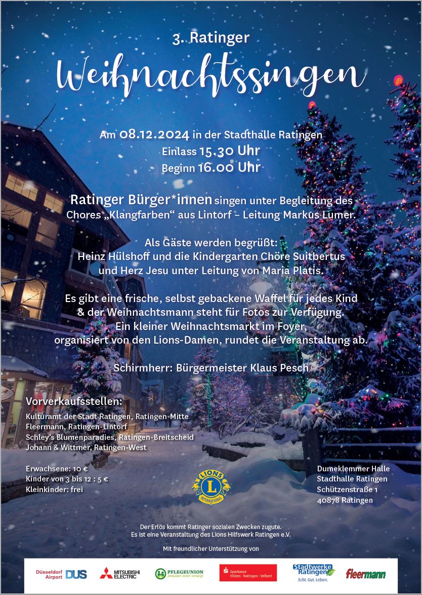 Auch in diesem Jahr lädt der Lions Club Ratingen am zweiten Advent, dem 8. Dezember, herzlich zum festlichen Weihnachtssingen in die Stadthalle ein.